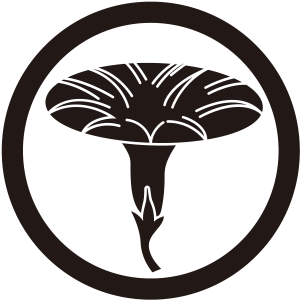 丸に朝顔紋は、『朝顔紋』を描いて、その周りを通常の太さの丸で囲う。比較的新しい家紋。