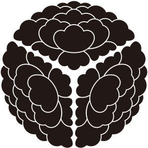 | 牡丹紋とは、キンポウゲ科の落葉灌木である牡丹の花を文様化した家紋。奈良時代に薬用、観賞用のため中国から伝わったものだが、中国では花の中の王「百花王」といわれ、富貴の象徴とされた。古くから衣服の文様としても用いられており、歴史的に著名な家紋だが、現在では使用家は少ない。摂関家である近衛家や鷹司家の家紋として知られており、そのつながりから伊達や津軽といった大名家でも用いられている。 |