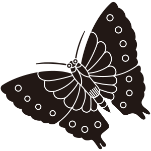 | 蝶紋とは、古代から日本に生息する蝶を紋章化した家紋。文様としては奈良時代から見られ、平安末期の平氏の一門がこの紋をよく用いたことから平家の家紋として知られる。蝶は幼虫から蛹(さなぎ)に変態し、やがて華麗に飛び立つさまが不死再生をイメージさせることから、吉祥的な意義で用いられた。図案としては、左右対称に羽を広げたものや、羽を閉じて上に上げている様を横からみたものがある。東海地方、とくに三重県に多い家紋。 |