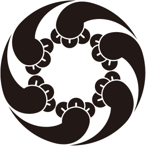 六つ追い丁子紋は、6本の『丁子紋』をそれぞれ追いかけるように並べて描く。野津家の家紋ということで『野津丁子』とも呼ばれる。