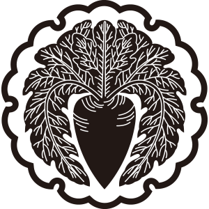 | 大根紋は、野菜の大根を紋章化した家紋。春の七草の1つで、無病息災、平穏無事を願う意義で家紋となった。また二股大根は歓喜天や大黒天の神紋でもあり、宗教的な意義で使用している家もある。 |