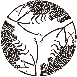 | 海老紋とは、伊勢海老を図案化した家紋。海老は正月の飾りやおせち料理にも欠かせないようにめでたい生き物で、長い髭と曲がった尾が腰が曲がるまで長生きすると長寿の象徴として、古くから吉祥の動物とされ珍重された。吉祥的な意義で家紋となった。 |