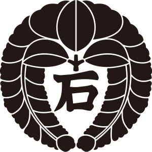 下り藤に石文字紋は、『下り藤』を描いて、その花房の輪の中に『石文字』を据えて描く。石田三成の旗紋として知られる。