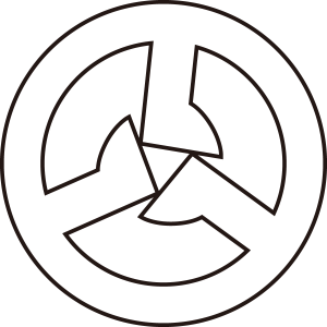 | 五徳紋とは、火鉢や囲炉裏の灰の中に据えて鍋や鎌を乗せる道具の「五徳」を紋章化とした家紋。もとは輪を上にして用いた竈子(くどこ)を、茶道具の炉に合せて上下逆さまに用いたことから「くどこ」を逆にして「ごとく」と呼ぶようになった。五徳の字は仏の六つの徳である「自在(じざい)」「熾盛(しせい)」「端厳(たんげん)」「名称(めいしょう)」「吉祥(きっしょう)」「尊貴(そんき)」の「六徳」にちなみ、天井から吊るす道具である「自在鉤(じざいかぎ)」を使わない道具ということから「自在」を除いた「五徳」の字が当てられたもの。兵法や儒教の五つの徳に通じることから家紋となった。 |