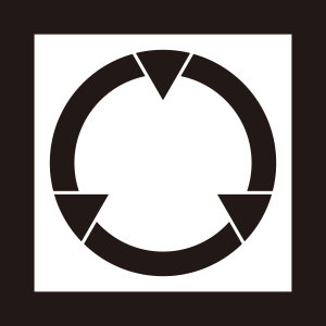 | 五徳紋とは、火鉢や囲炉裏の灰の中に据えて鍋や鎌を乗せる道具の「五徳」を紋章化とした家紋。もとは輪を上にして用いた竈子(くどこ)を、茶道具の炉に合せて上下逆さまに用いたことから「くどこ」を逆にして「ごとく」と呼ぶようになった。五徳の字は仏の六つの徳である「自在(じざい)」「熾盛(しせい)」「端厳(たんげん)」「名称(めいしょう)」「吉祥(きっしょう)」「尊貴(そんき)」の「六徳」にちなみ、天井から吊るす道具である「自在鉤(じざいかぎ)」を使わない道具ということから「自在」を除いた「五徳」の字が当てられたもの。兵法や儒教の五つの徳に通じることから家紋となった。 |