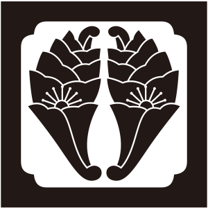 小城花杏葉紋は、通常より枚数が2枚多い『抱き花杏葉』を描いて、その周りを『大夫角』で囲う。肥前小城藩鍋島氏の定紋。