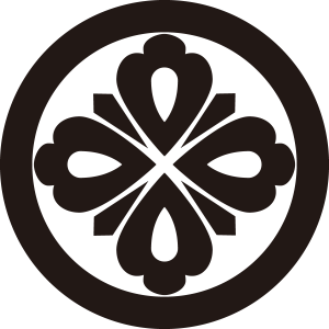 丸に四つ目形剣花角紋は、花菱紋の一種で、『四つ目形剣花角』を中心に描いて、その周りを通常の太さの円で囲う。「丸に四つ目形剣花角」