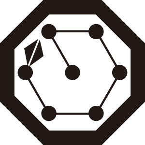 八角に北斗七星紋は、七つの星を中心から六角形になるように配置し線で結び、さらにその周りを『八角』で囲う。茨城県にある星宮神社の神紋。