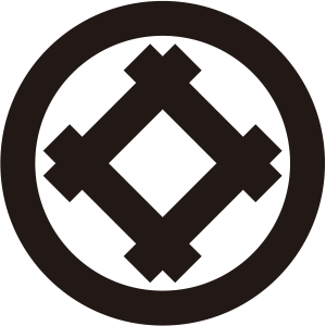 丸に隅立て井筒紋は、『隅立て井筒』を描いて、その周りを通常の太さの丸で囲う。井筒紋の中では一番多く使用されている家紋。