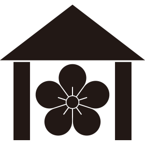 庵に梅の花紋は、三角形と2つの長方形で作った『庵紋』の中に『梅紋』を据えて描く。