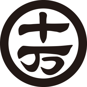 丸に十万文字紋は、筆勢の「十万」の文字を縦書きに描いて、その周りを通常の太さの丸で囲う。「十万」は仏教用語の「十万億土」のことで極楽浄土を意味し、願望を持って紋とした。