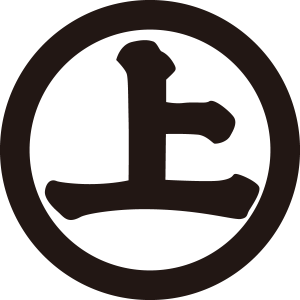 丸に上文字紋は、『上文字』を描いて、その周りを通常の太さの円で囲う。別に『丸上(まるじょう)』とも。また「上」の字の上にある点が下向きになっていることから「さげ上(じょう)」とも呼ばれる。上文字紋ではもっとも多く用いられており、甲信越、瀬戸内地方に多く分布している。