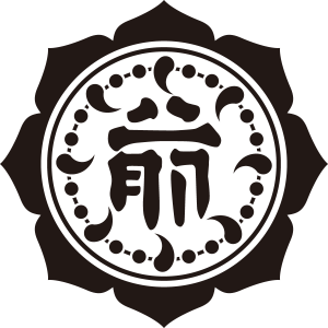 鏡に御統紋は、花形の鏡をかたどった輪の中に勾玉をつなげた御統を描き、中心に「前」の文字を描く。千葉県にある玉前神社の神紋。