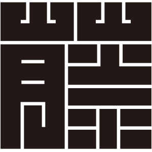 | 角字紋は文字紋の一種で、正方形の中に曲線を用いずに描かれる。文字紋は文字を紋章化したもので、家々で独自に設定され用いられることも多く、バラエティに飛んでいる。 |