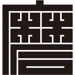 | 角字紋は文字紋の一種で、正方形の中に曲線を用いずに描かれる。文字紋は文字を紋章化したもので、家々で独自に設定され用いられることも多く、バラエティに飛んでいる。 |