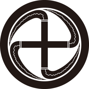 丸に四つ鎌車紋は、4本の鎌の柄を合体させた『四つ鎌車』を描いて、その周りを通常の太さの丸で囲う。