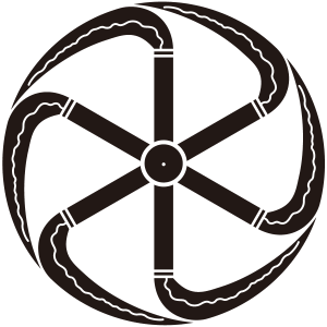 六つ鎌車紋は、6本の鎌の柄を合体させ車状にし、全体を丸くなるように描く。