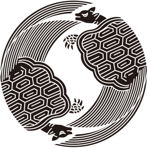 | 亀紋とは、蓬莱山にすむという霊亀を図案化した家紋。亀は古くから長寿を象徴する動物で、家紋として描かれる亀には長い毛と耳が生えているものが多く、紋章では蓑亀(ミノガメ)と呼んでいる。文様としても古くから用いられているが、家紋となったのは比較的に新しく、江戸時代以降が多い。長寿など瑞祥的な意義で用いられた。 |