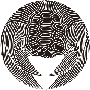 | 亀紋とは、蓬莱山にすむという霊亀を図案化した家紋。亀は古くから長寿を象徴する動物で、家紋として描かれる亀には長い毛と耳が生えているものが多く、紋章では蓑亀(ミノガメ)と呼んでいる。文様としても古くから用いられているが、家紋となったのは比較的に新しく、江戸時代以降が多い。長寿など瑞祥的な意義で用いられた。 |