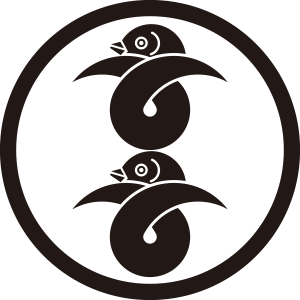 細輪に二つ結び雁金紋は、2つの『結び雁金』を上下に2つ並べ、その周りを通常より細い丸(細輪)で囲う。