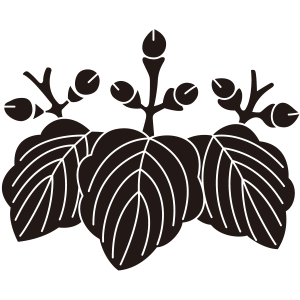 柏桐紋は、3枚の柏と7つの実を『五三桐』に見立てて描く。