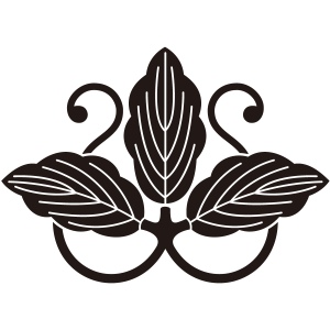 蔓巻き柏紋は、3枚の柏の葉を広げ、枝を後ろ左右に蔓状に巻き上げて描く。