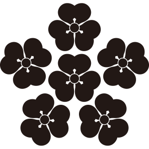 六つ片喰紋は、片喰紋の一種で、6つの『片喰紋』を五角形になるように配して描く。「六つ片喰(むつかたばみ)」