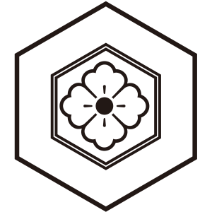 | 亀甲紋は亀の甲羅のような正六角形の連続紋四様から紋章化したもの。古代より世界中で使用された文様で日本には大陸から伝わり、5世紀以降の古墳からもその図柄が出土している。幾何学的な美しさと長寿の亀の甲羅を連想させる単純な形で瑞祥的な意義により家紋となった。 |