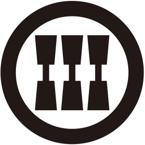 丸に三つ並び杵紋は、『三つ並び杵』を中央に描いて、その周りを通常の太さの丸で囲う。「丸に三つ並び杵」