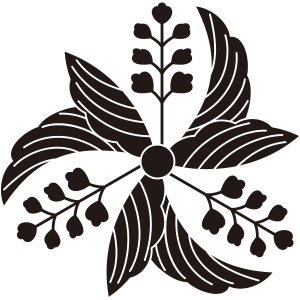 | 桐はアオギリ科の落葉広葉樹。鳳凰が住む嘉木とされる梧桐(あおぎり)に由来する家紋だが、デザイン的には別種の白桐が元となっている。もともと天皇家の紋章だが、功を挙げた臣下に賜与されることにより次第に広まっていった。梅、藤、木瓜、片喰とともに五大家紋の一つ。 |