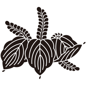 | 桐はアオギリ科の落葉広葉樹。鳳凰が住む嘉木とされる梧桐(あおぎり)に由来する家紋だが、デザイン的には別種の白桐が元となっている。もともと天皇家の紋章だが、功を挙げた臣下に賜与されることにより次第に広まっていった。梅、藤、木瓜、片喰とともに五大家紋の一つ。 |