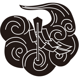 雲に御幣紋は、細かく渦を巻いて右から尾を出す雲を描き、中心に1本の御幣を立てる。
