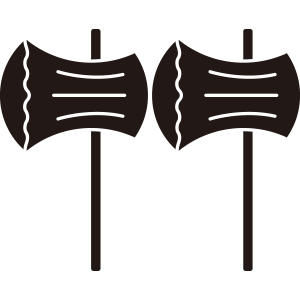 | 鉞は大型の斧のこと。鉞は古代中国の皇帝の権威の象徴であり、日本でも東国征伐に向かう日本武尊(ヤマトタケルノミコト)に天皇自ら鉞を授けたことが日本書紀に記されている。家紋としては尚武的な意義によるもの。 ちなみに鉞は魔除けとして表に三本、裏に四本の筋があり七つ目という。 |