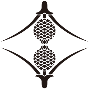 向い松毬菱紋は、『松葉菱』を描いて、その中に2つの松毬を向かい合わせに描く。