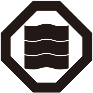 | 折敷紋とは、神事や食事に用いられた角盆をモチーフとした家紋。上古の時代、木の葉を折り敷いて食器の代用としていたことから「折敷(おしき)」と呼ばれる。後に檜の薄い板を折り曲げて角盆として食物を乗せる台となった。折敷紋はこれを上から見た形を象ったもの。基本的に外殻とし、中に他の家紋を描くことが多い。伊予国大三島の大山祇神社(三島神社の総本社)の神紋として「折敷に三の字」が用いられ、三島明神を信仰する越智氏一族の多くが家紋として使用するようになった。越智氏一族の戦国大名河野氏や一柳氏、稲葉氏、久留島氏などが使用している。 |
