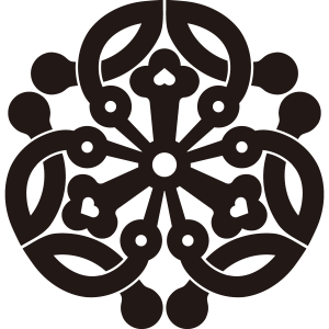 | 連翹(れんぎょう)はモクセイ科レンギョウ属の総称で、春に華やかで美しい黄色い花をつける。丁子唐草文様から発生した家紋と考えられ、尚美的意義により家紋となった。連翹紋の使用家が公家の正親町三条家、姉小路家、武家の千葉氏、戸田氏の4家で、ともに藤原北家公季流なため藤原氏公季流の代表紋といえる。 |