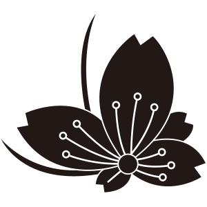 | 桜紋とは、日本の花の代名詞であり、国の花でもある桜の花をモチーフとした家紋。桜は、古くから田植えの時期を知らせる花として、「木花咲耶姫(このはなさくやびめ)」の化身とされた。家紋としては、散る、儚いイメージから当初は武家の家紋としては敬遠されたが、その優美なデザインから文様として愛用され、江戸時代には細川氏や松平氏、仙石氏といった大名家を含め、幕臣でも20数家が用いている。他に、木花咲耶姫を祀る神社が神紋として用いており、神社関連や名字に「桜」の文字を含む家の使用は多い。 |