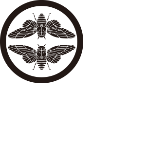 | 蝉を図案化した家紋。家紋としては非常に希少で家紋の実形、由来などは不明。紋章は秋田書店発行の家紋大図鑑著者「丹羽基二」氏の想定図案を書き起こしたもの。 |