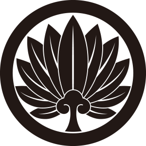 | 棕櫚紋は、植物の棕櫚(しゅろ)の葉をモチーフとした家紋。棕櫚は古来より日本に育成するヤシ科の常緑樹のことで、心霊の依代とされ、棕櫚団扇には神通力が宿るという。妖怪の天狗がもっている団扇がまさに棕櫚団扇。宗教的な意義により家紋となった。 |
