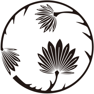 | 棕櫚紋は、植物の棕櫚(しゅろ)の葉をモチーフとした家紋。棕櫚は古来より日本に育成するヤシ科の常緑樹のことで、心霊の依代とされ、棕櫚団扇には神通力が宿るという。妖怪の天狗がもっている団扇がまさに棕櫚団扇。宗教的な意義により家紋となった。 |