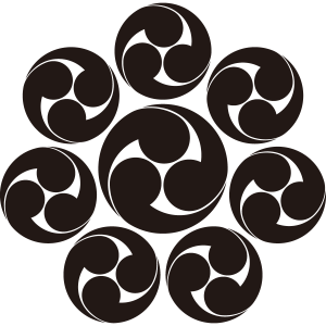 八曜巴紋は、8つの『左三つ巴』を一つを少し大きめに中心に描いて、それを囲むように7つ並べて『八曜』の形状に描く。