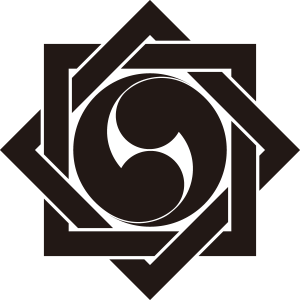組み合い角に右二つ巴紋は、『右二つ巴』を描いて、その周りを『組み合い角』で囲う。