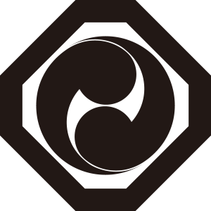 隅切り角に左二つ巴紋は、『左二つ巴』を描いて、その周りを『隅切り角』で囲う。
