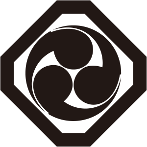 隅切り角に三つ巴紋は、『左三つ巴』を描いて、その周りを『隅切り角』で囲う。