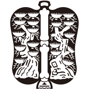 奥平団扇紋は、『唐団扇』の盤面に9つの梢を持つ松を2本並べて描く。豊前中津藩奥平氏の家紋。
