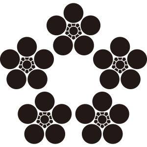 五つ梅鉢紋は、5つの『梅鉢紋』を五角形の形に並べて描く。